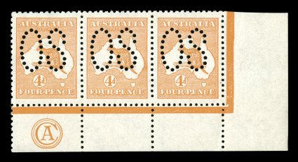 300 nh 15ba/zb image#15ba/zb, 4p Orange, large "OS", gem bottom right corner margin CA monogram strip of three from Plate 2, each stamp in the strip being incredibly well centered and margined, deep vibrant color, o.g., n.h., light diagonal crease in right sheet selvage only, extremely fine; an incredibly rare and desirable "OS" monogram strip (for hinged A$7,500). (Image) Est. 4,000-5,000