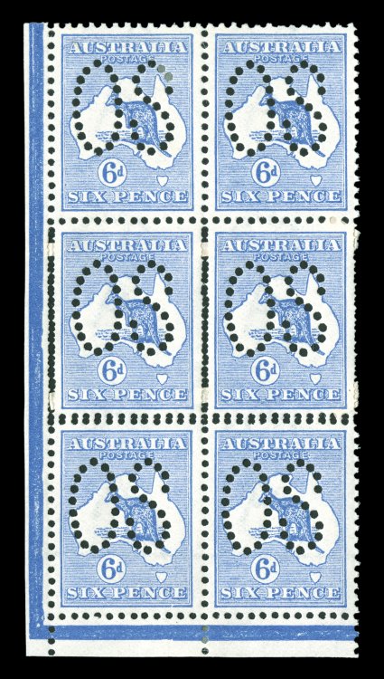 perforations, striking bottom left corner margin block of six (2x3),