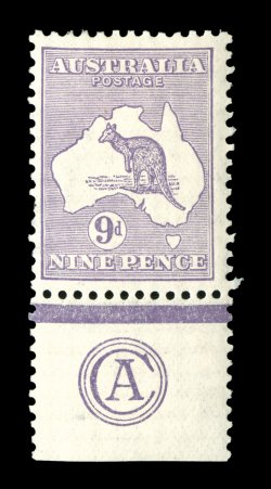 362 og 25za image#25za, 9p Violet, bottom margin CA monogram single from the left pane of Plate 2 (lower), fresh color, nicely centered, o.g., l.h., short perf. at left, otherwise very fine and rare (A$4,000). (Image) Est. 2,000-3,000