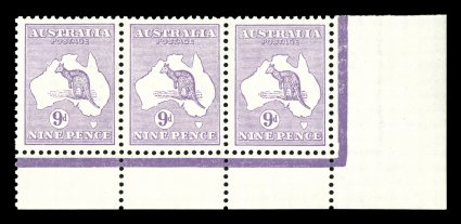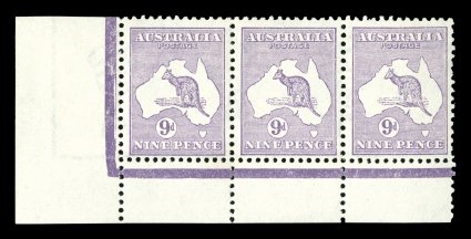 363 og 25zd image#25zd, 9p Violet, the unique bottom left corner margin no monogram strip of three from Plate 1 (upper), fresh color, well centered, o.g., l.h., very fine; among the most important monogram pieces extant, as only this and the strip in the next lot are the only no monogram strips recorded, this being from the left pane, with the next strip being from the right pane; obviously undercataloged considering their extreme rarity; ex-Abramovich (A$15,000). (Image) Est. 10,000-15,000