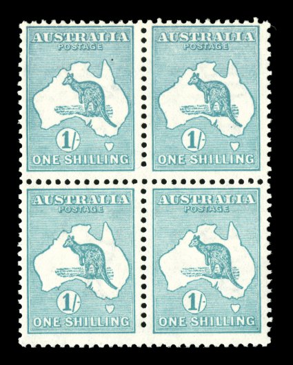 366 nhbl 31A image#31A, 1/- Emerald, block of four, exceptionally fresh, rich color, o.g., n.h., interesting missing perforation at bottom of each pair between the stamps (seems to be a prevalent variety on many of the Second Watermark issue 1/- values), top left stamp with small corner crease at top left, fine (A$5,000+). (Image) Est. 2,000-3,000