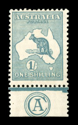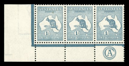 369 nh 31Bz image#31Bz, 1/- Bright blue green, the important bottom left corner margin CA monogram strip of three from Plate 1 (upper), in a most magnificent state of preservation, brilliantly fresh and crisp, superbly centered, pristine o.g., n.h., extremely fine in every respect; an extraordinary rarity both in terms of the few recorded and condition; a monogram strip for the finest collection (for hinged A$17,500). (Image) Est. 15,000-20,000