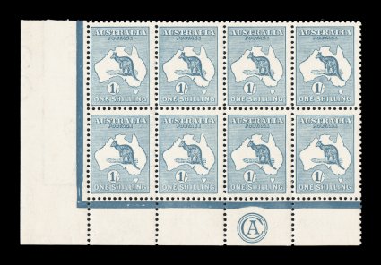 371 og/nhbl 31Bzb image#31Bzb, 1/- Bright blue green, the remarkable bottom left corner margin CA monogram block of eight from Plate 2 (lower), extraordinarily fresh and crisp, strong distinctive color, attractive centering, o.g., all stamps n.h., lightly hinged in the sheet selvage only, overall very fine; one of the rarest and most important monogram pieces of the entire Second Watermark issue; ex-Kilfoyle (as a hinged strip of three and five n.h. singles A$23,750+). (Image) Est. 15,000-20,000