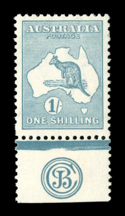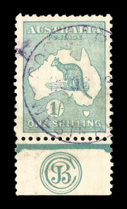 376 og 31Bzg image#31Bzg, 1/- Bright blue green, a fabulously well centered JBC monogram single from Plate 2 (lower), with four uniformly large margins, rich color, o.g., minor h.r. mainly in sheet margin, extremely fine; among the finest of the few known monogram singles (A$6,000). (Image) Est. 3,000-4,000