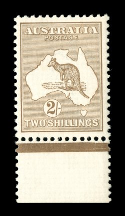 378 og 36 image#36, 2/- Light brown, a superb bottom sheet-margin single, flawlessly centered, prooflike impression on immaculate paper, o.g., barest trace of hinging (if at all), extremely fine gem; a stamp for the perfectionist (A$850). (Image) Est. 400-500