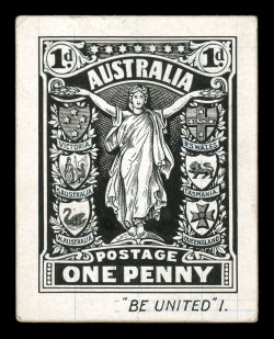 27 E E65 image#E65, 1911 Stamp Design Competition "Allegorical Figure and Coats-of-Arms" original artwork by Maximilian Tannenberg, measuring 44x47mm on thick card (54x59mm), intricate pen and ink drawing, endorsed at bottom "Be United I", very fine and unique; Tannenberg was a distinguished artist and the designer of several stamps of Victoria and South Australia in the 1890's; ex-Ray (A$7,500). (Image) Est. 5,000-7,500