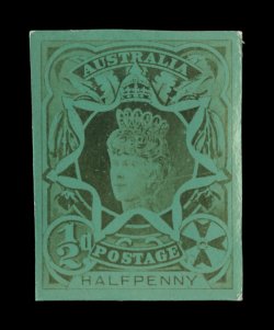 29 E E100 image#E100, 1911 Stamp Design Competition entries by R.H. Irwin, ½p Queen Mary in black on green, lithographed on green surface colored glazed paper, very fine; this, and the next seven different R.H. Irwin essays that follow, are unique and are the only examples recorded (A$2,500). (Image) Est. 2,000-3,000