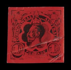 30 E E101 image#E101, 1911 Stamp Design Competition entries by R.H. Irwin, 1p King George V in black on red, lithographed on red surface colored glazed paper, two diagonal creases, the only known example of this design (A$2,500). (Image) Est. 2,000-3,000