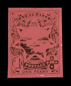 40 E E109 image#E109, 1911 Stamp Design Competition entries by a Mr. Grant of Wonthaggi, Vic., 1p King George V in rectangular frame in scarlet, letterpress on white wove paper, hinged to small piece of white glazed card, very fine; the only recorded original example (A$2,500). (Image) Est. 2,000-3,000