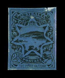 33 E E103 image#E103, 1911 Stamp Design Competition entries by R.H. Irwin, 2½p View of Sydney Harbour in black on blue, lithographed on blue surface colored glazed paper, small surface scuffs at top and mounting thin; the only known example of this design (A$2,500). (Image) Est. 2,000-3,000