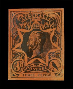 34 E E104 image#E104, 1911 Stamp Design Competition entries by R.H. Irwin, 3p King George V in black on orange, lithographed on orange surface colored glazed paper, very fine; the only known example of this design (A$2,500). (Image) Est. 2,000-3,000