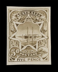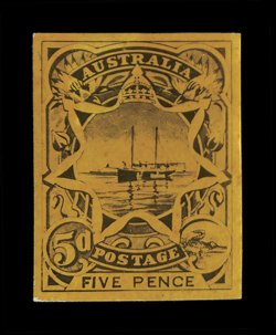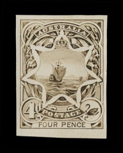 35 E E105 image#E105, 1911 Stamp Design Competition entries by R.H. Irwin, 4p Ship in black on cream, lithographed on cream surface colored glazed paper, very fine; the only known example of this design (A$2,500). (Image) Est. 2,000-3,000