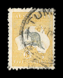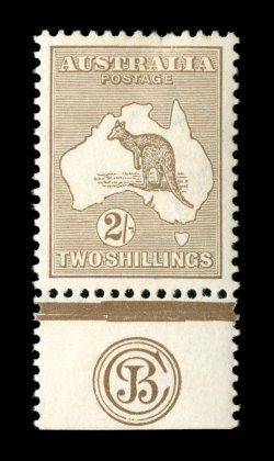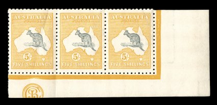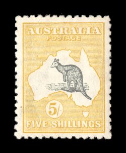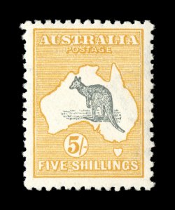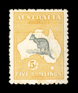 391 og 43c image#43c, 5/- Deep grey and yellow, doubly printed frame, a wonderfully choice mint example of this major Kangaroo rarity, being from the original discovery strip (in 1915) of four which was subsequently separated into two pairs and then into four singles, this copy was the left hand stamp in the discovery strip, the second impression of the frame appears 8mm below the first and is best seen with an upper frame line which appears just above the Kangaroo's head, well centered, brilliant colors, o.g., l.h., very fine and choice; only four mint non-"OS" examples of this rarity are recorded, all from the original discovery strip, with one now residing in the Australia Post archival collection; 1977 Royal Philatelic Society certificate for a horizontal pair, this being the left stamp; ex-Baillie (A$25,000). (Image) Est. 15,000-20,000