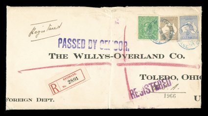 385 c 36 image#36, 2/- Light brown, well centered single, along with 6p Kangaroo (Second Watermark) and a ½p George V, tied to large registered linen-backed envelope to Toledo, Ohio by blue "Registered/14.JY.1915/Brisbane" c.d.s., San Francisco transit and Toledo arrival c.d.s. on reverse, cover reduced a bit at both ends, central vertical file fold, fine; a rare usage of the 2/- Second Watermark on cover, with most other recorded usages being on a parcel label; perfect for exhibition. (Image) Est. 1,500-2,000