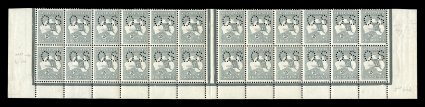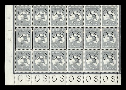 394 og/nhbl 6ba/b/zd image#6ba/b/zd, 2p Grey, small "OS", double perforation, a most remarkable bottom left corner margin no monogram block of 18 from Plate 1, with sheet selvage on three sides, with the entire center horizontal row of stamps displaying double perforations on three sides, position 1L55 showing the "retouched left frame and shading N.W. of map" variety, extraordinarily well centered, rich color, o.g., most stamps n.h., just lightly hinged on a couple of stamps in in the sheet selvage, with usual small gummed paper strips applied by the Printing Office reinforcing row with double perforations, very fine; one of the most important and striking 2p Grey Second Watermark multiples; ex-Nelson where it realized A$7,250, plus the 12% buyer's premium (A$5,000). (Image) Est. 4,000-5,000