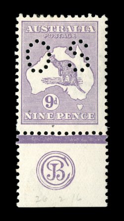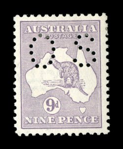 397 og 25ba image#25ba, 9p Violet, small "OS", choice mint single of this scarce stamp, exceptionally well centered and margined, o.g., minor h.r., very fine (A$1,250). (Image) Est. 500-750