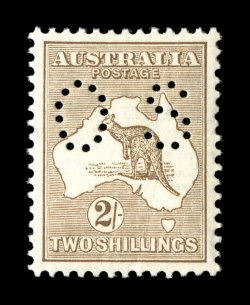400 og 36ba image#36ba, 2/- Light brown, small "OS", extraordinarily well centered, fresh color, o.g., barest trace of hinging, two diagonal gum bends/creases, otherwise very fine (A$2,250). (Image) Est. 500-750