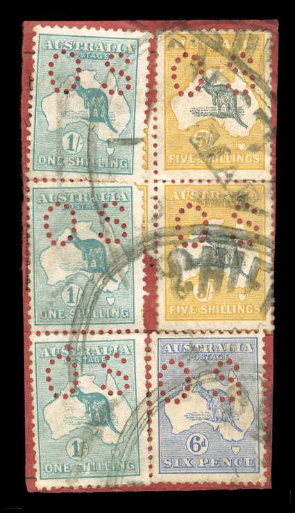 402 O 43b image#43b, 5/- Deep grey and yellow, small "OS", vertical pair, along with a single 6p and three 1/- Second Watermark issues, all with small "OS" punctures, tied to large part of red parcels label by huge oval "Chief Parcel Office/Melbourne" datestamp, stamps with small usage flaws and wrinkles as to be expected, as this parcel was surely quite large and bulky, a most unusual high value "OS" franking (as used stamps A$1,065). (Image) Est. 500-750