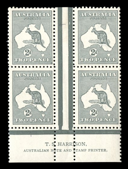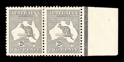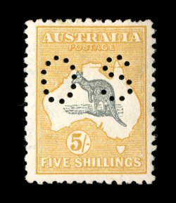 403 og 43b/c image#43b/c, 5/- Deep grey and yellow, doubly printed frame, small "OS", wonderfully fresh mint example of this key Kangaroo rarity, of the mere five examples recorded punctured "OS", this is the only mint stamp, vibrant colors on bright paper, well centered, o.g., barest trace of hinging (if at all), very fine; this example, like the unpunctured mint example, shows a second impression of the frame approximately 8mm below the first; an amazing auction event to have not one, but three, examples of the double frame variety in the same sale, unpunctured and punctured small "OS" mint copies, as well as an unpunctured used example (A$31,250). (Image) Est. 15,000-20,000