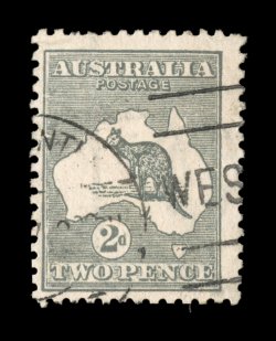 408 O 7ib image#7ib, 2p Grey black, Die IIA, substituted cliche, handsome used example of this rare variety, where for Cooke's third printing of this value in 1917 position 1L55 was substituted with a cliche in the Die IIA state which had been used for stamped-to-order postal stationery, this particular example showing an advanced state of Die IIA with large breaks in the outer frame line at left, neat and light "Fremantle (WA)" machine cancel, couple of minor nibbed perfs., nearly very fine; ex-Nelson (A$1,250). (Image) Est. 750-1,000