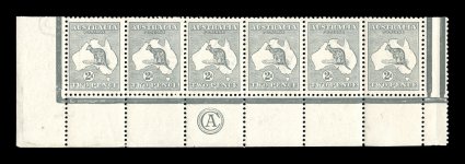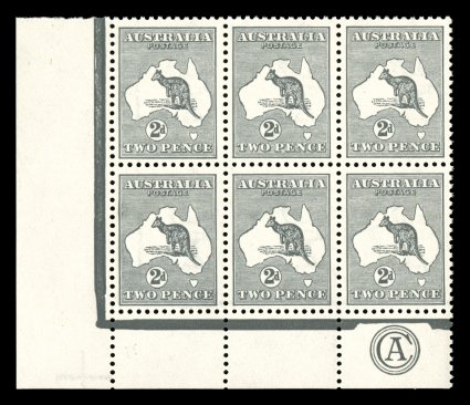 410 og/nhbl 7z image#7z, 2p Grey black, Die I, gem bottom left corner margin CA monogram block of six from Plate 1 (upper), with position 1L55 showing the "retouched left frame and shading on N.W. of map" variety, indicating that this is the pre-substituted cliche, and is the only such monogram block recorded, incredibly fresh and crisp, particularly well centered, rich color, o.g., five stamps n.h. (including monogram), l.h. on top right stamp and in left sheet selvage only, an extremely fine and handsome example of this very scarce monogram multiple which is significantly undercataloged; ex-Col. Evans (A$4,000+). (Image) Est. 3,000-4,000