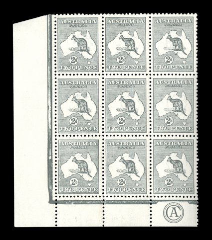 411 og/nhbl 7za image#7za, 2p Grey black, Die I, with substituted Die IIA cliche, an exceptional example being the bottom left stamp [1L55] in a bottom left corner margin CA monogram block of nine from Plate 1 of the third Cooke printing, position 55 was substituted with a Die IIA cliche taken from the stock of electrotypes used for postal stationery, well centered, rich color, o.g., seven stamps including the substituted cliche and monogram single are never hinged, couple of minor h.r.'s elsewhere, very fine; extremely rare to find this important variety contained within a monogram multiple, in fact only this monogram block and a complete pane (ex-Pope) include the substituted cliche; greatly undercataloged (for hinged A$7,500+). (Image) Est. 5,000-7,500