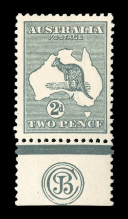 413 og 7zb image#7zb, 2p Grey black, Die I, bottom margin CA monogram single from Plate 1 (upper), nicely centered, o.g., minor h.r., nearly very fine; ex-Col. Evans (A$500). (Image) Est. 200-300