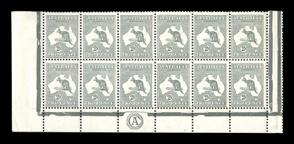 420 nhbl 8z image#8z, 2p Silver grey, Die IIA, pristine bottom left corner margin inserted CA monogram block of twelve from Plate 3 (upper), being the bottom two rows of lower left pane, with sheet margins on three sides, quite fresh, strong color, attractive centering, o.g., n.h., lightly folded along central vertical row of perforations (not affecting monogram unit), very fine (for hinged strip of three and nine n.h. singles A$1,450+). (Image) Est. 750-1,000