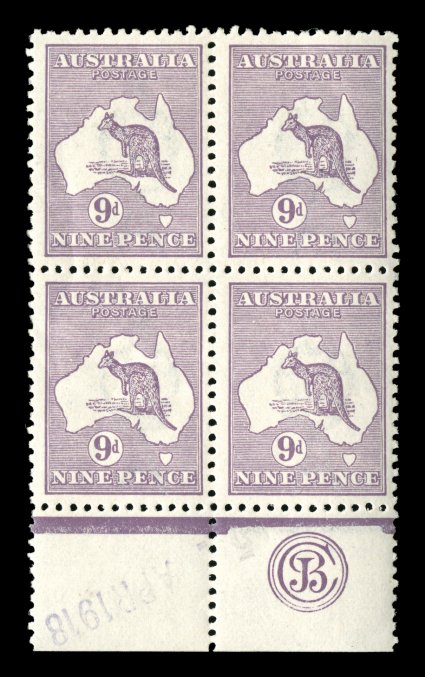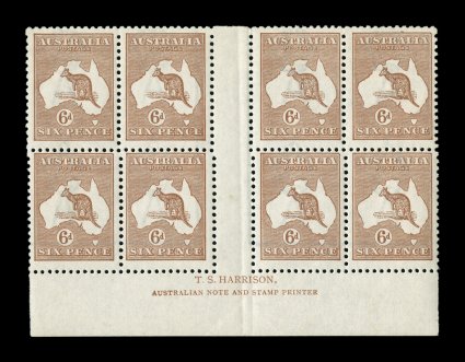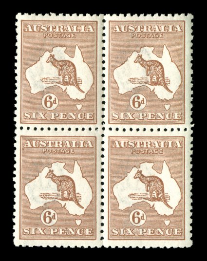 502 nhbl 21c image#21c, 6p Chestnut, offset, a visually stunning right sheet-margin block of four, displaying a strong complete offset on all four stamps, easily being one of the most dramatic offset examples we have ever seen on a Kangaroo issue, fresh, well centered, o.g., stamps apparently n.h. (hinged in selvage), some separated perforations between selvage and stamps, very fine (A$8,000+). (Image) Est. 5,000-7,500