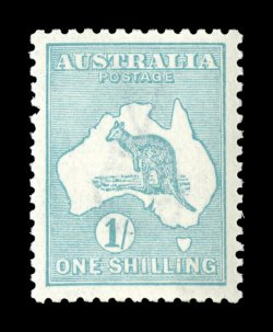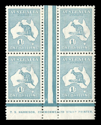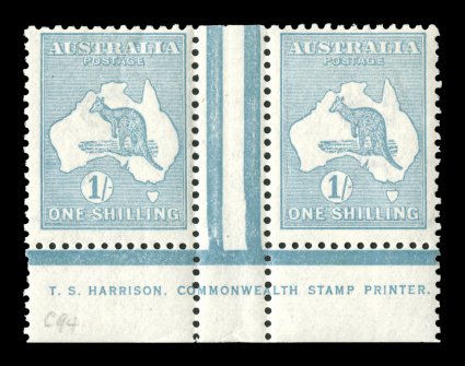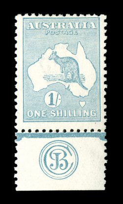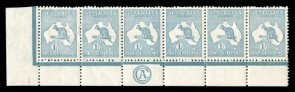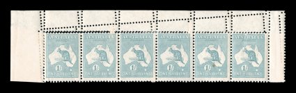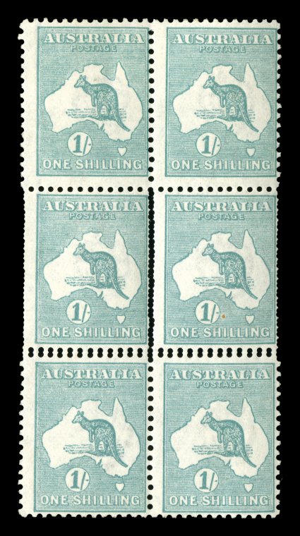 558 og 33Bb image#33Bb, 1/- Pale blue green, Die IIB, double perforations, official substitution of a complete horizontal strip of six at the top of the left pane, required because of an aberrant strike of the perforating comb in the top margin that would have extended into the design of all six original stamps, while the usual small repair tabs are evident at top and at the bottom of the strip, it remarkably was inserted with the selvage at both sides still attached resulting in margins of double thickness, while such major substitutions are occasionally found in the King George V series, this is an unusually large substitution for a Kangaroo issue, yellowish o.g., small toned spot on the reverse of one stamp, fine and striking. (Image) Est. 750-1,000