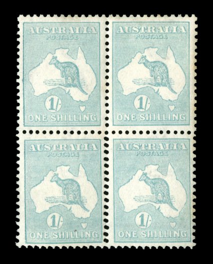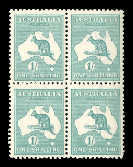 556 ogbl 33Bb image#33Bb, 1/- Pale blue green, Die IIB, double perforation, block of four, bottom pair displaying almost coincident double perforations at sides and at bottom, although both perforations almost superimposed on one another, well centered, o.g. which is a bit "dull", very fine (A$600+). (Image) Est. 300-400
