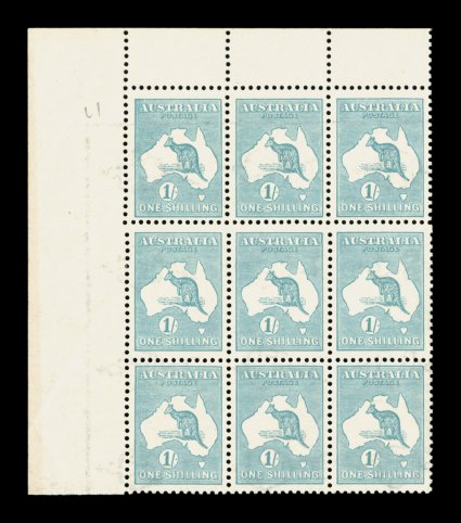 555 nhbl 33Caa image#33Caa, 1/- Bright blue green, Die IIB, watermark sideways, an impressive top left corner sheet-margin block of nine, with the sheet selvage being particularly helpful to see (at a glance) the sideways watermark, with position 4L1 being the "broken top frame at left" variety, exceptionally well centered, o.g., n.h., very fine; a wonderfully choice and scarce multiple (for hinged A$900+). (Image) Est. 750-1,000