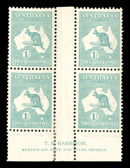 562 ogbl 33Cz image#33Cz, 1/- Bright blue green, Die IIB, bottom margin T.S. Harrison imprint block of four from Plate 3, with stop after "PRINTER", uncharacteristically well centered, strong color, o.g., hinge reinforcement of several separated perforations at bottom of first vertical row, otherwise very fine (A$1,500). (Image) Est. 500-750
