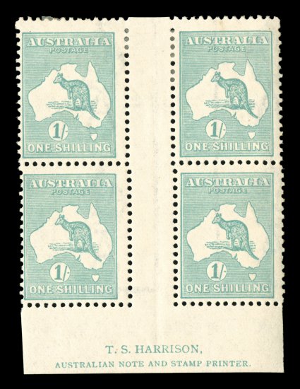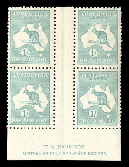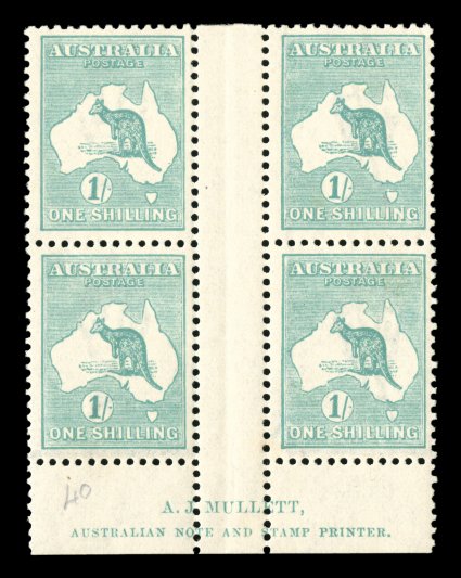 567 ogbl 33Czb image#33Czb, 1/- Bright blue green, Die IIB, bottom margin A.J. Mullett imprint block of four from Plate 4 (upper), especially fresh and rather well centered, o.g., minor h.r. on top pair, lower unit n.h., very fine (A$1,000). (Image) Est. 400-500