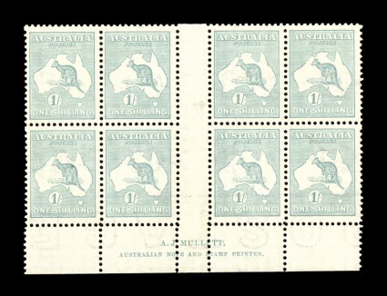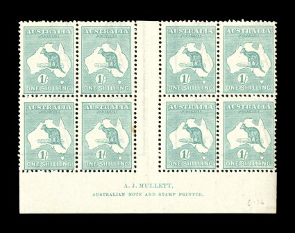 568 ogbl 33Baa/zb image#33Baa/zb, 1/- Pale blue green, Die IIB, watermark sideways, a gem bottom margin A.J. Mullett imprint block of eight from Plate 3 (upper) with sideways watermark clearly evident from the face, incredibly well centered for this scarce imprint multiple, o.g., very lightly hinged, very fine and exceptionally choice (for imprint block of four and four singles A$2,400+). (Image) Est. 1,500-2,000