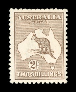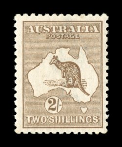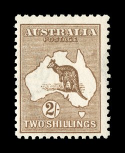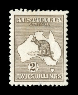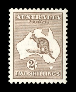 574 og 37F image#37F, 2/- Aniline red brown, a mint example of this very rare and seldom offered shade, the majority of which were overprinted "N.W. Pacific Island" for use in New Guinea, deep luxuriant color on fresh paper, o.g., l.h., very fine; an important Kangaroo shade variety that is almost never seen (A$3,000). (Image) Est. 1,500-2,000