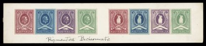41 E E112A,C,D, E114 var. image#E112A, C, D, 1911 Stamp Design Competition entries by E.T. Luke, Cockatoo in oval, framed by lyrebird tail, four different colors, blue, violet green and red, the latter with "One Penny" inscription added to the design, all affixed to original art board measuring 227x46mm, with "Pigmented Bichromate" manuscript notation at bottom in artist's hand, on the left side of the board are four different colored King George V essays similar to the design of #E114, but without value tablets in the corners and "Postage" in small lettering below portrait, in the same colors as the Cockatoo essays to the right (the red example with "One Penny" added as well), very fine; a unique series of essays (for eight essays A$16,000). (Image) Est. 7,500-10,000