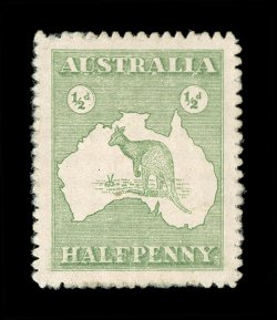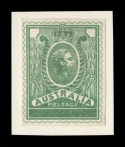 49 E KE12 image#KE#12 1912½p Kangaroo and Map second essay, with two value tablets at top and Tasmania omitted, Type 2 vertical format design, in green on thin white card with saw-tooth roulette 14 ½, well centered within huge margins, bright and fresh, faint thin spot of no consequence, extremely fine.This vertical format design was determined to be less cluttered and better suited to stamp production, but the map of Australia was crudely drawn and the island state of Tasmania was omitted - leaving future modification inevitable. The Type 2 essay is even rarer than the Type 1, as there were five examples in different denominations recorded, although one (a 4p value) was in a private collection stolen in 1984 and it has never been recovered. Of the remaining four, one (a 6p value) is in the R.T.P. Chapman Collection, now part of the Australia Post archival collection. Thus, only three examples are left in private hands.In the same April 2006 auction (Prestige Philately) that the 2½p First Essay appeared, a single Type 2 Second Essay was offered - an imperforate 1p value in carmine rose. And just like the First Essay, the irrelevance of the catalog value assigned to the Second Essays (A$75,000 each) was demonstrated, as the 1p essay realized an impressive A$167,000 (including the 15% buyer's premium and 10% GST). We suspect that the appearance of this value will also re-write its current catalog value. This literally may be the last opportunity to acquire a Type 2 essay in our lifetimes; ex-Abramovich. (Image) Est. 75,000-100,000