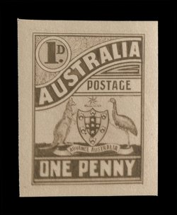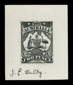 45 E image1911 Stamp Design Competition entry by J.E. Wilby, photographic stamp-size essay of 2p design featuring a kangaroo, ostrich and Coat-of-Arms within a crudely drawn map, with larger than usual margins around the design and signed "J.E. Wilby" of the Victorian Government Printing Office, very fine. (Image) Est. 400-500