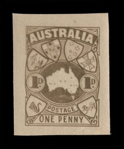 57 E KE34 image#KE34, 1912½p Red Kangaroo and Map third essay, with only one value circle at top and Tasmania included, Type 3a, half-tone (photographic) print on thin glazed paper, measuring 72x77mm, extremely fine; on April 3, 1912 samples of the Third Essay were distributed by the Postmaster General to his Cabinet colleagues, it is believed these were half-tone reproductions, possibly created because J.B. Cooke (printers) had no further printed essays available; one of only four recorded, one of which is in the Australia Post archival collection, this particular example being especially desirable as it is not cut down like the other two examples that exist in private hands (A$10,000). (Image) Est. 7,500-10,000