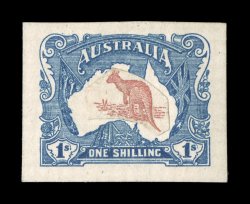 47 E KE5 image#KE#5, 1912 1/- Map superimposed upon upon the Royal Standard and Australian Flag, Type 1 bi-colored paste-up essay in brownish red and blue, horizontal format on imperforate white wove paper, blue frame printed from letterpress blocks prepared by Rudolph Steel at the Block Arcade, Melbourne, with central Kangaroo vignette in brownish red being a cut-out and pasted in place within the map, wide margins, extremely fine and stunning.After rejecting the winning entries in the 1911 competition, Postmaster General Frazer commissioned Blamire Young of the Victorian Artist's Association late in that year to prepare alternative designs. It is recorded that Young delivered ten designs to the Postmaster General in January 1912, and recently discovered press announcements indicate that one of these designs showed a Kangaroo superimposed on a map of Australia. There are a total of nine recorded First Essays in seven different denominations based on this design, of which five were acquired (amazingly as one lot in the 1981 Williamson auction in London) by R.T.P. Chapman, whose collection was subsequently acquired intact by the Australia Post. This leaves only four in private hands and it is speculated that one of these may have been lost. Of the remaining three, the Gray collection presented here, has not one, but two of these immensely rare and important Kangaroo essays.Of the three essays in private hands of which we are aware, one is a mono-colored 2½p value in bright blue with saw-tooth roulette 14 ½. The other two offered here are the remarkable bi-colored paste-up essays in 1/- and 5/- denominations (see next lot). With one notable exception, these essays are never available at public auction. However, the April 2006 appearance at auction (Prestige Philately, lot #6) of the 2½p mono-colored essay mentioned above created quite a sensation. The rare chance to acquire one of these historically significant essays resulted in a record realization of A$172,500 (including the 15% buyer's premium), clearly demonstrating not only the terribly conservative evaluation of A$75,000 assigned in the Australian Commonwealth Specialists' Catalogue, but also showing the strength of the market for Australian Kangaroo rarities. We fully expect that this essay, and the one that follows, will create their own sensation and will result in similarly eye-opening realizations - and deservedly so; ex-Abramovich. (Image) Est. 75,000-100,000