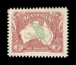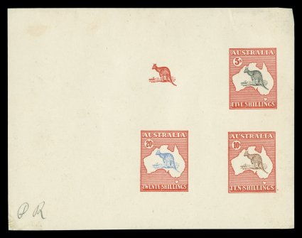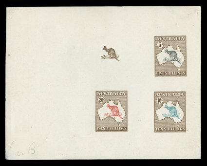 51 E KE24Ga image#KE24Ga, 1912 Single Kangaroo vignette and 5/-, 10/- and 20/- Kangaroo and Map third essay, with only one value circle at top and Tasmania included, Type 3 vertical format design, uncut sheetlet of four stamps, the kangaroo vignette in brown, the 5/- in brown and black, the 10/- in brown and green and the 20/- in brown and vermilion, on unwatermarked white wove paper measuring 118x93mm, printed from a letterpress block of four incorporating se-tenant values and, in the case of the high values, bi-colored printing, couple mounting thins in bottom corners of little significance, very fine.According to the ACSC, "these essays were distributed to the press on 2 April 1912 as examples of the approved design, and this distribution may be the source of most examples extant." The use of bi-colored printing for the high value essays suggests that an early decision had been made that these denominations would be bi-colored for the issued stamps. A number of color combinations were used, but there is no evidence that these sheetlets were used for selection of the issued colors. There are only eight intact high value essay sheetlets recorded, each in different color combinations, one being in the Australia Post archival collection.These rare high value essay sheetlets possess spectacular eye appeal and as such will certainly command considerable bidder interest; ex-Abramovich (A$75,000). (Image) Est. 50,000-75,000