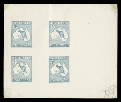 50 E KE20Da image#KE20Da, 1912½p, 1p, 2p and 3p Kangaroo and Map third essay, with only one value circle at top, the map redrawn and Tasmania included, Type 3 vertical format design, uncut sheetlet of four stamps, in blue green on unwatermarked white wove paper measuring 118x90mm, printed from a letterpress block of four incorporating se-tenant values and, in the case of the low values, mono-colored printing, top corners with light glazing from old mounting, single pinhole well away from the stamp impressions, none of which are relevant due to this sheetlet's unique status.According to the ACSC, "these essays were distributed to the press on 2 April 1912 as examples of the approved design, and this distribution may be the source of most examples extant today." While there are eight sheetlets of the high values recorded, the sheetlet offered here is the only uncut sheetlet of the low values that still exists today. Therefore, this remarkable essay sheet of Type 3 low value essays can be considered the rarest of all known Kangaroo essays. The only other unsevered multiples of the low values are two vertical pairs, one of which is in the Royal CollectionAn amazing rarity of significant importance and desirability, whose catalog value (A$100,000) while considerable will, in our opinion, ultimately prove to be conservative for this premier artifact of Australian philately. (Image) Est. 75,000-100,000