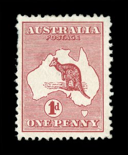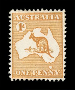 53 E KE28 var. image#KE28 var., 1912 1p Orange Kangaroo and Map third essay, with only one value circle at top and Tasmania included, Type 3 vertical format design, perforated 12½, on unwatermarked white wove paper, well centered, bright vibrant color, couple of really faint and trivial thin specks, still very fine; according to the ACSC there are only fourteen perforated Type 3 essays recorded in various colors and denominations, the vast majority of which are unique, two of which are in institutional collections, not included in this total, nor listed in their count is this 1p essay in Orange (neither are the 3p, 10/- and 20/- values which follow in colors other than those listed by the ACSC), only the 1p in Red (Australia Post archival collection) and Brown are listed; clearly an important unrecorded perforated Type 3 essay; the listed 1p Third Essay in brown is priced by ACSC at A$20,000, although that valuation proved quite conservative, as it realized A$57,500 (including premium) in Prestige Philately's April 2004 auction (lot #8). (Image) Est. 20,000-30,000
