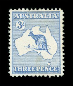 54 E KE30 var. image#KE28 var., 1912 3p Ultramarine Kangaroo and Map third essay, with only one value circle at top and Tasmania included, Type 3 vertical format design, perforated 12½, on unwatermarked white wove paper, well centered, fresh color, very fine; according to the ACSC, the only 3p perforated Third Essay is one in Orange, which is housed in the Royal Collection, therefore this 3p perforated Third Essay in ultramarine is not only unrecorded, it is the only example of this 3p essay in private hands (most of the listed perforated Third Essays are priced very conservatively at A$20,000 each). (Image) Est. 20,000-30,000