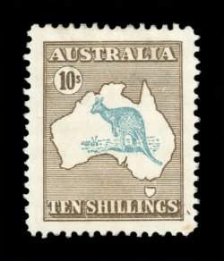 55 E KE32 var. image#KE32 var., 1912 10/- Brown and green Kangaroo and Map third essay, with only one value circle at top and Tasmania included, Type 3 vertical format design, perforated 12½, on unwatermarked white wove paper, extraordinarily well centered and margined, strong colors, minute thin speck, still extremely fine; according to the ACSC, the only two 10/- perforated Third Essays are found in blue green/pale green and violet/brown combinations, therefore this 10/- perforated Third Essay in brown and green is not only unrecorded, but unique in this color combination (the two listed 10/- color combinations are priced at A$27,500 each). (Image) Est. 20,000-30,000