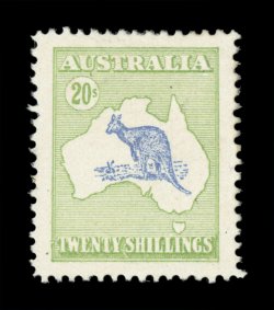 56 E KE33 var. image#KE33 var., 1912 20/- Green and blue Kangaroo and Map third essay, with only one value circle at top and Tasmania included, Type 3 vertical format design, perforated 12½, on unwatermarked white wove paper, extra-large and well balanced margins, strong colors, minute thin speck of no consequence, still extremely fine; according to the ACSC, the only two 20/- perforated Third Essays are found in turquoise/red orange and pale brown/red orange combinations, therefore this 20/- perforated Third Essay in green and blue is not only unrecorded, but unique in this color combination (the two listed 20/- color combinations are priced at A$27,500 each). (Image) Est. 20,000-30,000