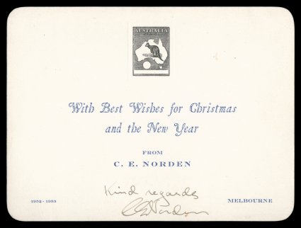 58 image1952 Christmas card from Melbourne dealer C.E. Norden with impression in black from the Kangaroo and Map master die, with blank value tablets, signed at bottom "Kind regards/C.E. Norden"; it was Norden who acquired the estate of the stamp's engraver, Samuel Reading, in which the original of the master die proof was found, which is now in the Australia Post archival collection; also accompanied by photographic reproductions of the original master die, as well as large die proofs of the 10/- £1 and £2 values, which Norden used to publicize his purchase; and finally an original price list produced by Norden entitled "Proofs by Samuel Reading" in which he lists and prices various proofs found in the Reading estate (in addition to the fantastic Kangaroo large dies, there were various proofs of Papuan stamps and an Australian postal card), it is interesting to note that the Kangaroo master die was available for 300 guineas! (Image) Est. 500-750