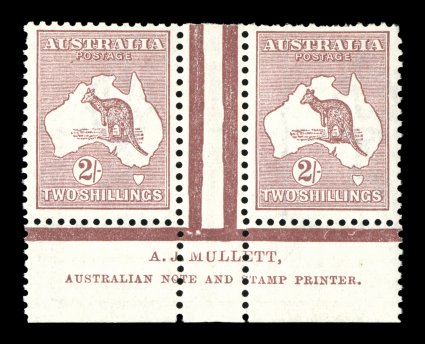 601 nh 38za image#38za, 2/- Maroon, bottom margin A.J. Mullett imprint pair from Plate 2 (lower), especially fresh, well centered, o.g., n.h., some shortened perforations at top right, otherwise very fine (cataloged only as a hinged block of four at A$1,250). (Image) Est. 300-400