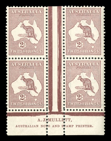 602 nhbl 38za image#38za, 2/- Maroon, bottom margin A.J. Mullett imprint block of four from Plate 1, exceptionally bright and fresh, well centered, o.g., n.h., some separated perforations at top of second vertical row, choice very fine (for hinged A$1,500). (Image) Est. 750-1,000